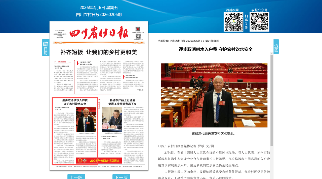 2月6日,《四川农村日报》头版刊发省人大代表、泸州市纳溪区杉树湾生态禽业专业合作社理事长古帮泽建议:《逐步取消供水入户费 守护农村饮水安》。