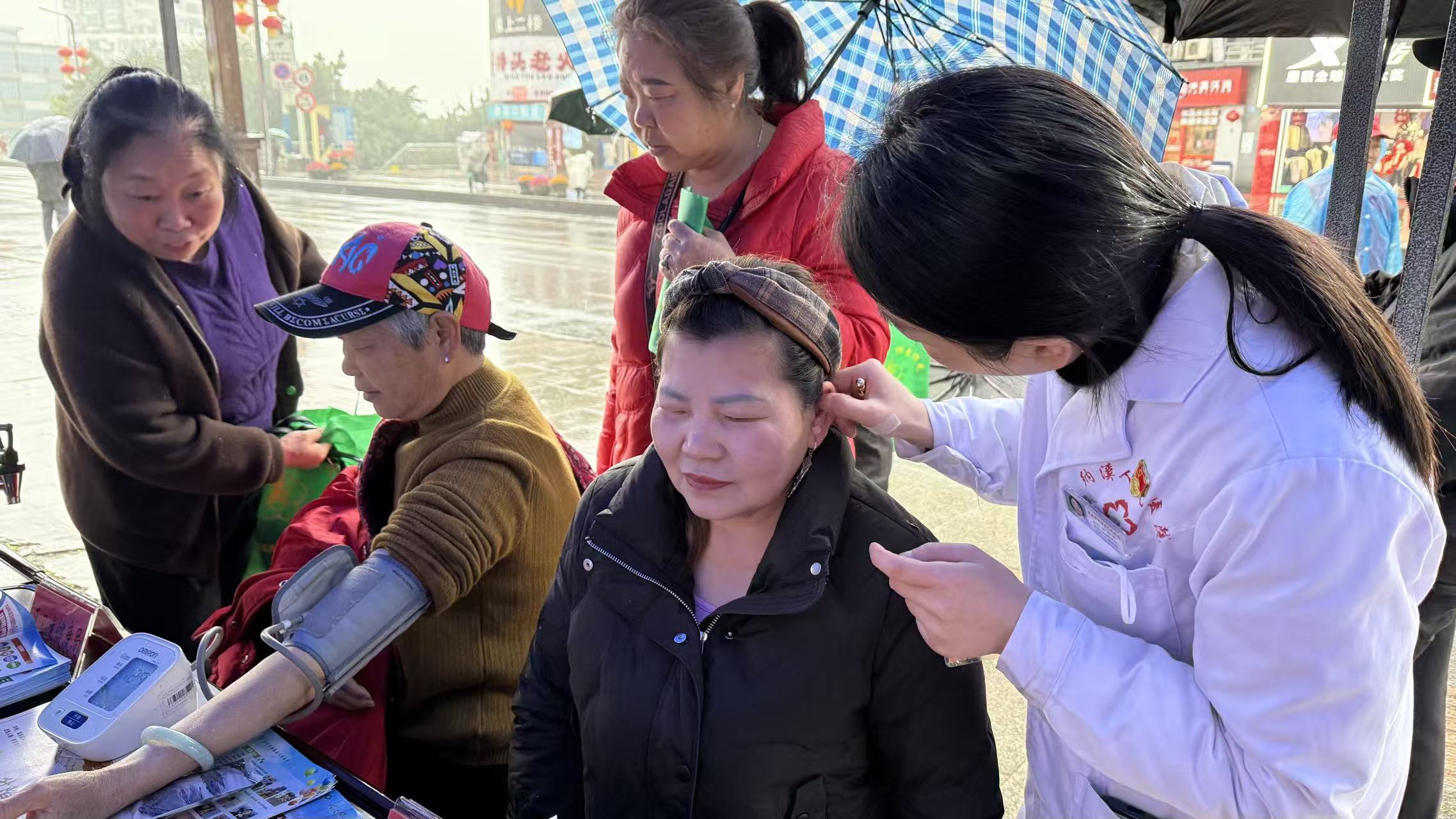 图为区人民医院医生为过往群众提供耳穴贴豆服务。江澜 摄