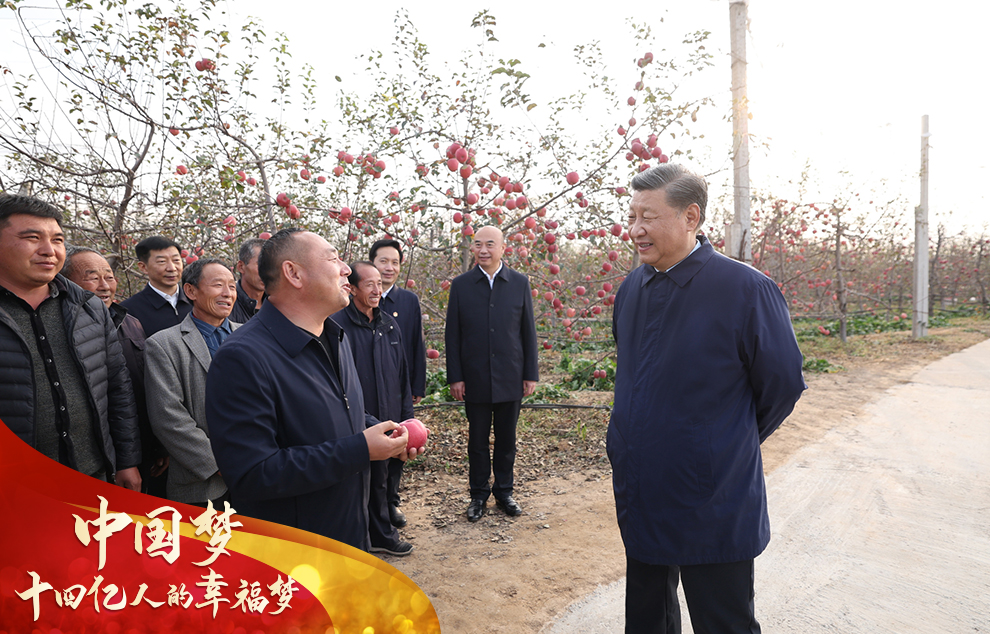 2022年10月26日,习近平总书记在延安市安塞区高桥镇南沟村苹果园同老乡们亲切交流。